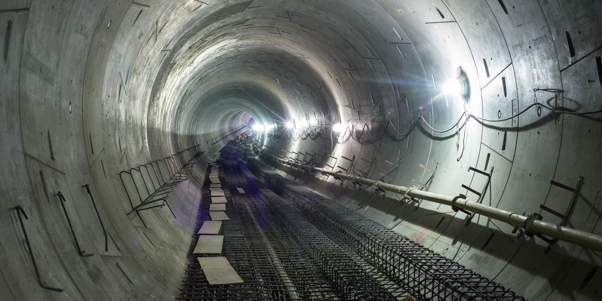 A long rebar skeleton travels up the northbound tunnel to the tunnel portal. Soon workers will pour concrete, creating the tunnel invert, which tracks will rest on.